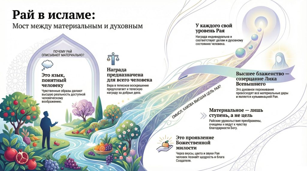 Рай в исламе предстает как реальность, в которой материальное и духовное соединяются в совершенном равновесии. Материальные описания служат доступным для человеческого понимания языком, с помощью которого передаётся идея вечности, полноты и божественной справедливости. Телесность в потустороннем мире — не регресс, а способ выражения и вознаграждения за функции, которыми человек был наделён. Высшее блаженство, при этом, не исчерпывается чувственным наслаждением; кульминацией остаётся духовное созерцание и близость к Создателю. Поэтому материальная форма Рая в исламской традиции следует понимать не как ограничение, а как просветлённую, преображённую среду, где всякое благодеяние достигает своего совершенства и где человеческая способность к радости преображается, становясь проводником глубочайших духовных истин.