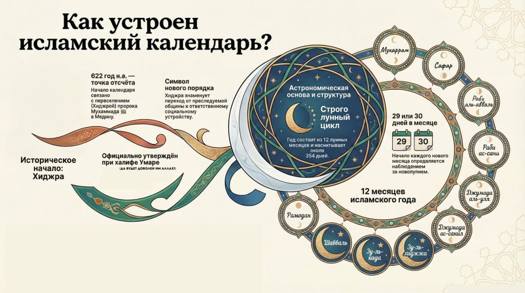 Исламское летоисчисление представляет собой целостную модель восприятия времени, в которой история, астрономия и духовный смысл образуют единое целое. Отсчёт от Хиджры подчёркивает значимость нравственного выбора и социальной ответственности, а лунная структура года напоминает о непостоянстве мира и цикличности человеческой жизни.