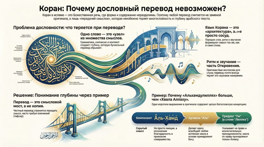 Дословный перевод Корана невозможен в строгом смысле не потому, что язык «слишком сложен», а потому что в Коране язык является частью Откровения. Перевод способен донести содержание, но не способен воспроизвести весь комплекс того, как содержание явлено. Именно поэтому корректнее говорить о переводе как о передаче смыслов, а не как о замене оригинала.